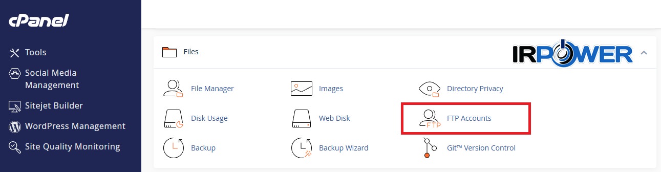 در صفحه اصلی cPanel، به دنبال بخش Files (فایلها) باشید. داخل این بخش، گزینهای با نام FTP Accounts وجود دارد. روی آن کلیک کنید.