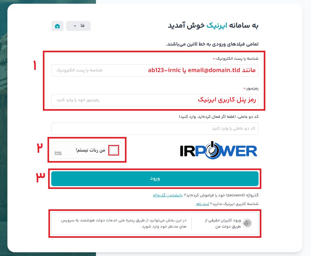 همانطور که می دانید برای ثبت دامنه IR که شامل کلیه پسوندهای دامنه های ملی که در انتها با پسوند دامنه IR منتهی می شود، توسط سازمان پژوهشگاه دانش های بنیادی یا ایرنیک (Nic.ir) انجام می شود. با توجه به سیاستهای نیک، تمامی ویژگیها و امکانات شناسه کاربری نیک (Nic Handle) به پنل نمایندههای آن داده شده است تا مالک دامنههای ملی به راحتی بتوانند با استفاده از ناحیهکاربری آن نماینده، اقدام به مدیریت دامنههای ملی خود نمایند. IRPOWER یکی از بزرگترین و قدیمیترین نمایندگان نیک، تمامی دسترسیهای لازم را جهت مدیریت دامنههای ملی در اختیار کاربران خود قرار داده است تا کاربران به سادگی بتوانند دامین های خود را از طریق ناحیه کاربری مدیریت نمایند. با این حال این امکان برای شما فراهم است تا بتوانید با انجام مراحل زیر به صورت مستقیم نیز به کنترل پنل دامنه های IR خود نیز دسترسی داشته باشید: